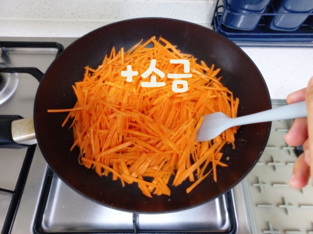 채 썬 당근은 기름을 두른 팬에 소금을 넣고 볶는다. 지켜 서서 타지 않도록 저어가며 너무 약하지 않은, 중불 정도에서 달달 볶아야 한다.